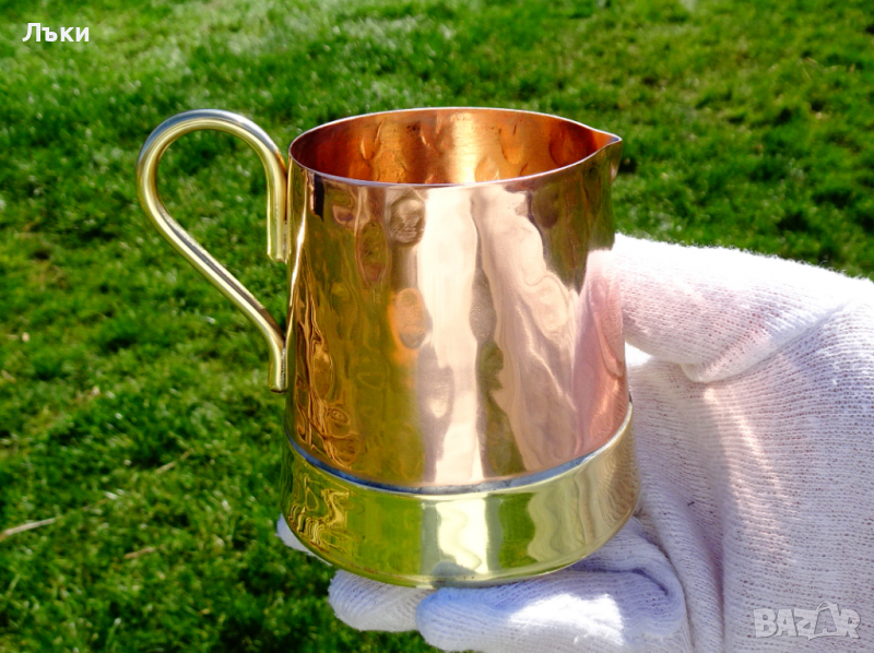 червена мед с нежен релеф и изключителен блясък.Дъното е подсилено с допълнителна месингова основа.От вътре не е калайдисана.Височина 8 см.,диаметър 7.5 см.,тегло 110 гр.Вместимост 200 мл.