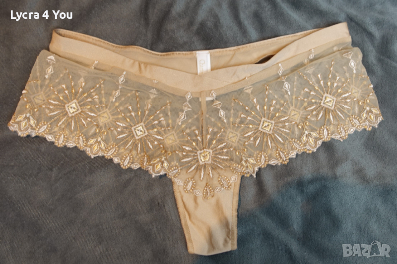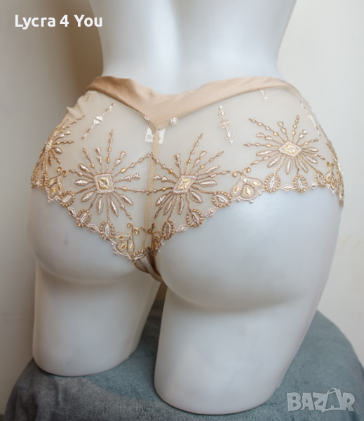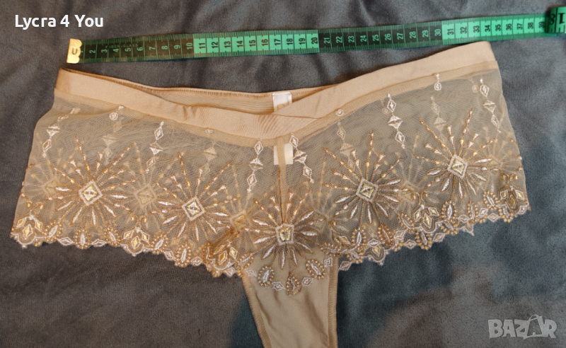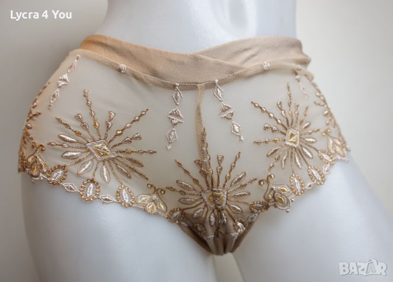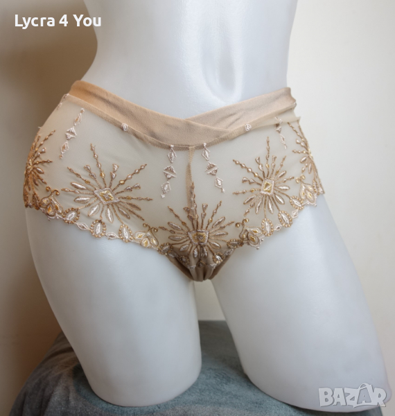 Като нов, луксозен дамски полубоксер с бродерии върху прозрачен телесен тюл. Подходящи за М размер, но може и на Л да станат, талията е 34см. с еластичност.