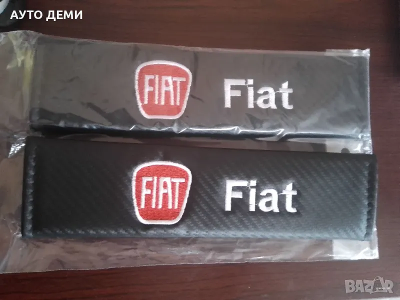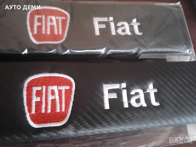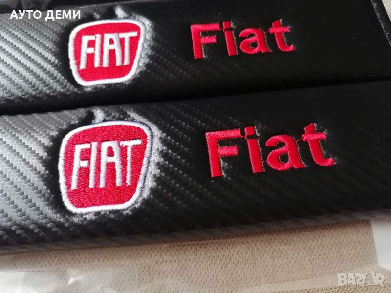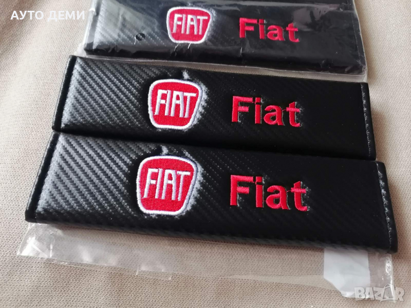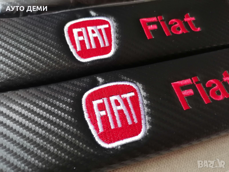 Продавам качествени черен карбон кожа протектори за авто колан с бродиран надпис и емблема на марката автомобил Фиат Fiat .