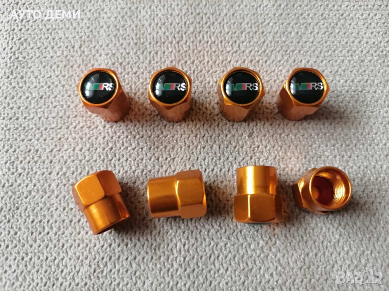 Продавам златисти капачки за вентили на гуми с емблеми на Skoda VRS изработени от неръждаем метал и прахово боядисани.