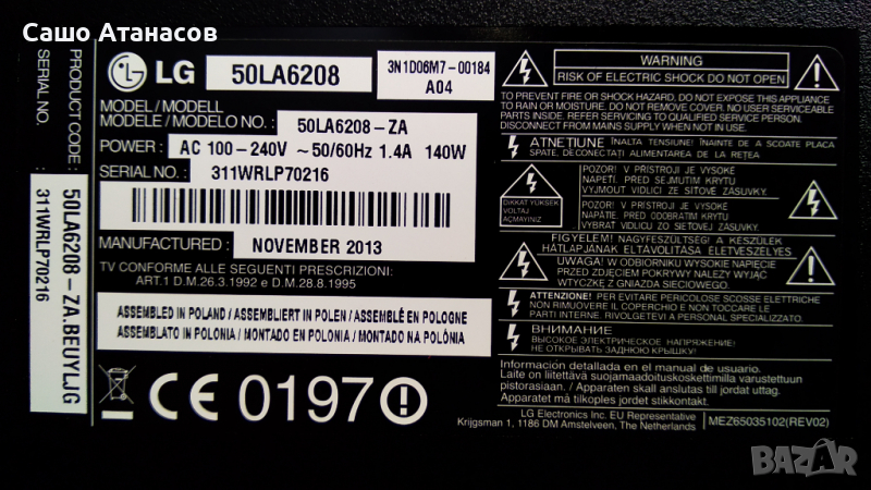 LG 50LA6208-ZA със счупена матрица ,EAX64905501(2.3) ,EAX64797004(1.1) ,6870C-0452A ,TWFM-B006D