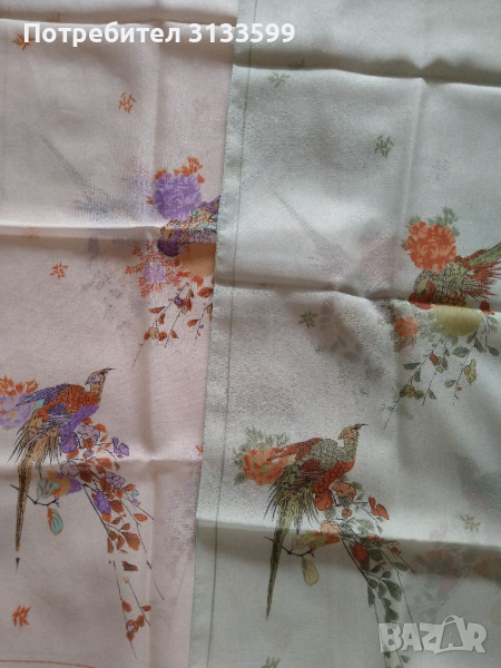 1. Два нови шала, ефирни - в бледо розово и в бледо зелено, с нарисувани "райски птици" в двата края на шала. Размери: 28/136 см. Снимки 1, 2 и 3.