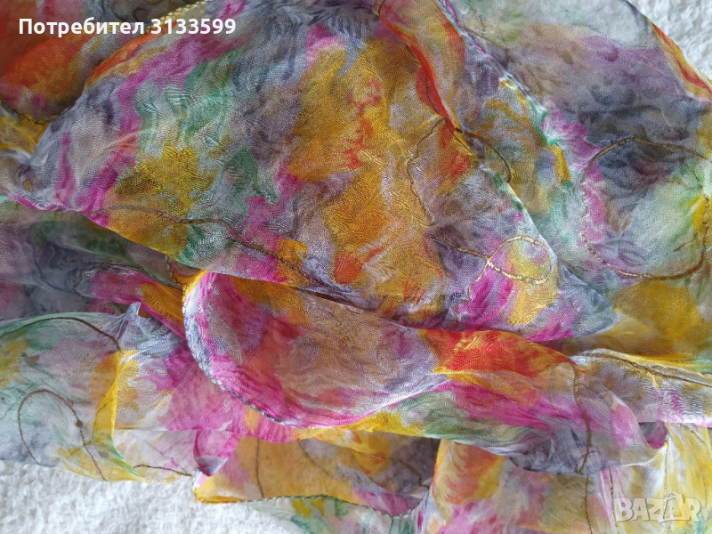 - шал в жълто, розово, синьо зелено и златисти нишки. Размери: 95/95 см.