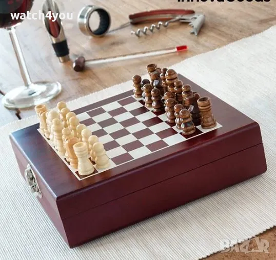 НОВ КОМПЛЕКТ АКСЕСОАРИ ЗА ВИНО В ЛУКСОЗНА ДЪРВЕНА КУТИЯ.СЕТ ЗА ВИНО ШАХ.КУТИЯ ЗА ВИНО.ШАХМАТНА ДЪСКА
