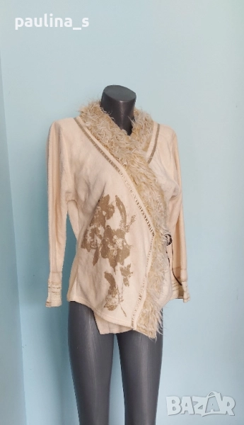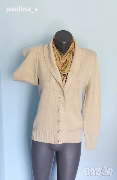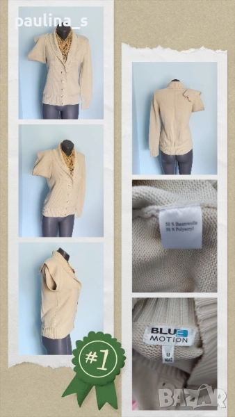2️⃣. L / XL - "Blue motion" - Цена 19,99лв / 10 евро. Дамска жилетка с шал яка в неутрален цвят Слонова кост, подходяща е за всички стилове и сезони. Преждата е памук с примеси, хипоалергична. Сулуетът е класически, елегантен, леко втален, дискретен стил и изисканост се подчертава с аксесоари, като нова, без дефекти и етикет. Шалът е от измачкана копринена органза.