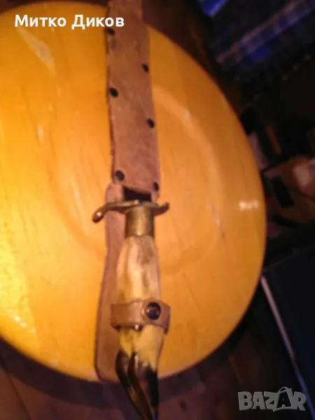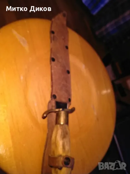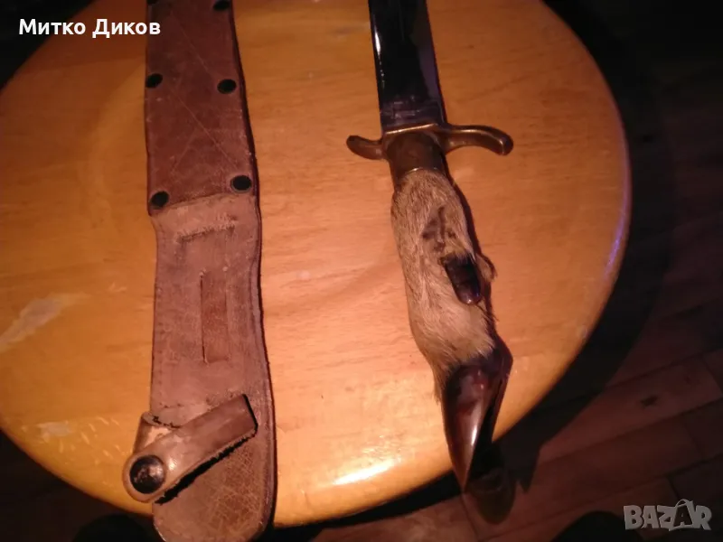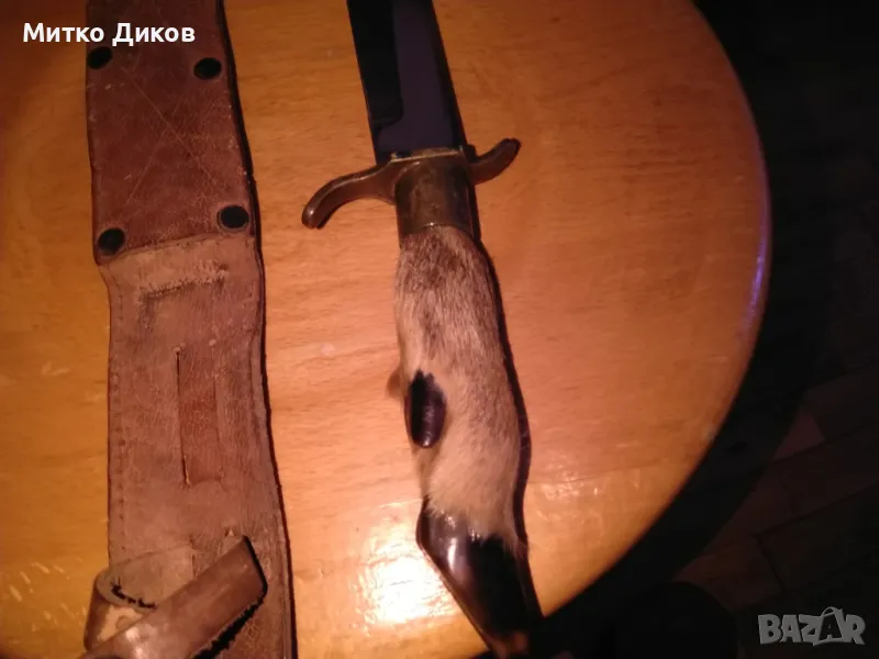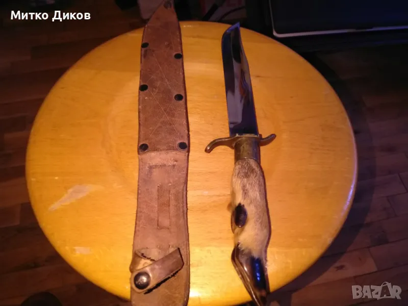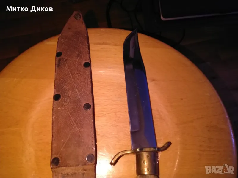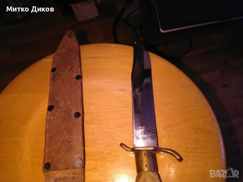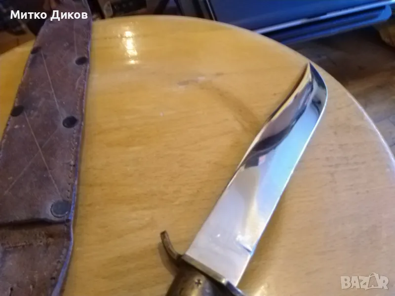 Ловен нож от соца калъф естествена кожа метален гард ръчно правен от майстор с инициали -звездички -нов-обща дължина 315мм и на острието 170мм--изпращам по еконт-по спиди от соца калъф естествена кожа