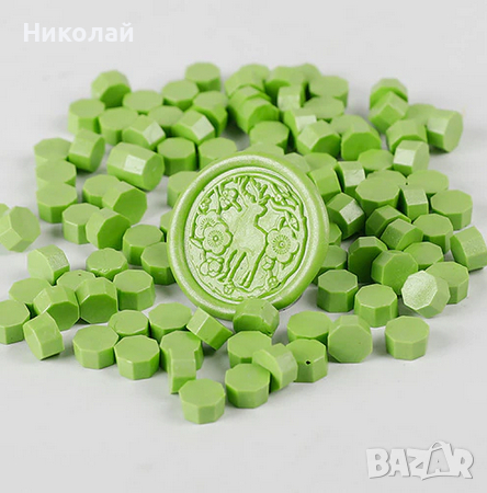 Комплект от 52 части : Печат със символ детелина , лъжица за разтопяване и 50 бр, зелени или червени восъчни парченца .