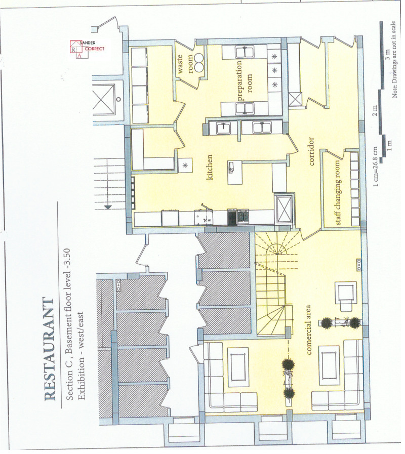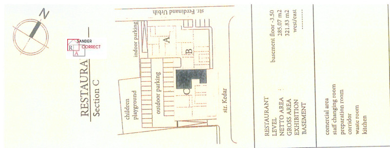 Статутът е Ресторант. Площта по нотариален акт е 285.07 кв.м. (321.83 кв.м. с общите части). На кота 0.0 са 162.50 кв.м., а на кота -3.50 са 122.57 кв.м. Отделен вход за зареждане през подземния паркинг. Осигурени са 120 киловата мощност. Подходящ е и за кетъринг, офис, представителство, клуб, онлайн магазин и други.