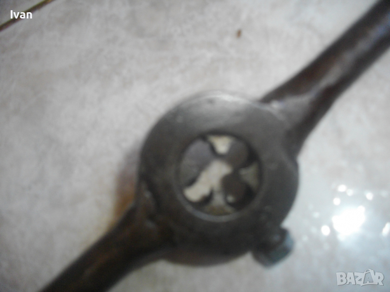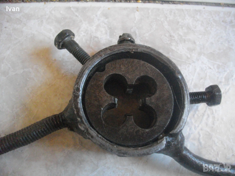 Плашка размер М12 -за резби 12 мм-ръчно правена, масивна. Цялостна дължина - 320 мм. Дръжките са заварени към главата, едната дръжка е извита за по-лесен захват на ръката при въртене. 4 резби на държача за притягане на поставена плашка.