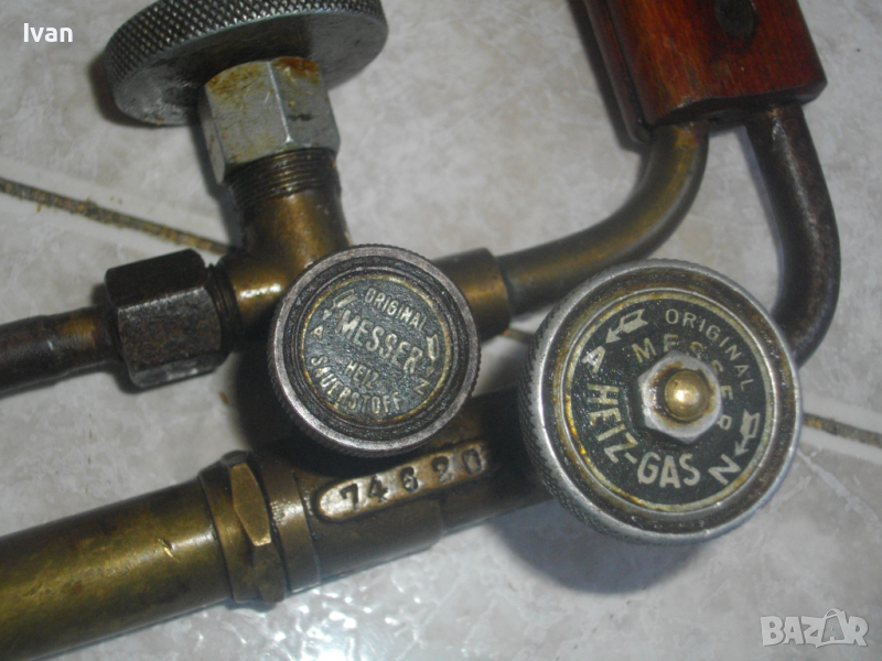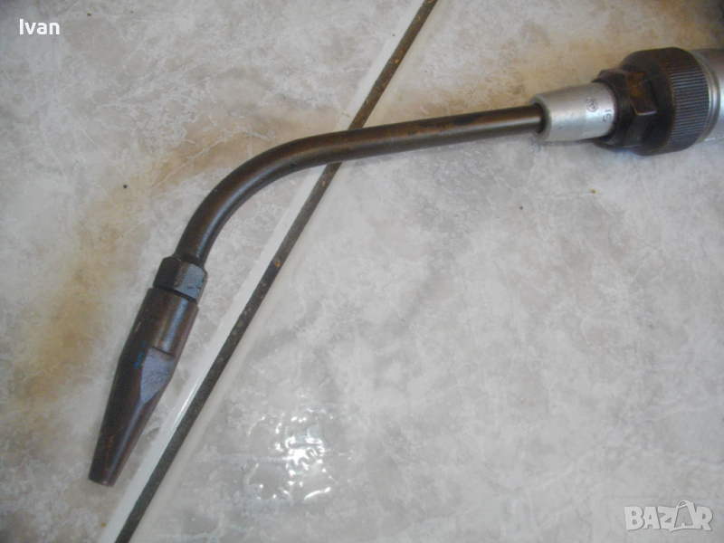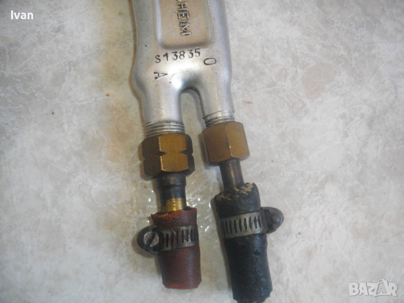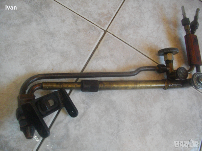 ДължинА на резак с извитите нагоре тръби-420 мм. 3 въртока, дървена дръжка за ръкохватка. Въртоците въртят съвсем леко и са в пълна изправност. Медни тръби с задни изводи за директно скачване с маркучи. Поставена дюза отпред оригинална с 1 голяма дупка.