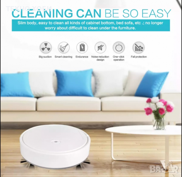 Спечелете, сега бързо и лесно битката с алергиите и почистете дома си без да ставате от леглото си. Как може стане това? Сега много, лесно и бързо, като включите прахосмокачката и оставите да свърши своята работа. Представяме ви прахосмукачката-робот Clean, с която успешно ще почиствате дома си и премахвате алергените от праха без капка напрежение! Чисто нова и иновативна технология, която предлага 1 час работен режим, без прекъсване. Може да почисти всяка една повърхност от дома или офиса ви. Снабдена с лазерен сензор и контейнер за събиране на отпадъка.