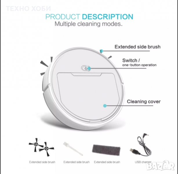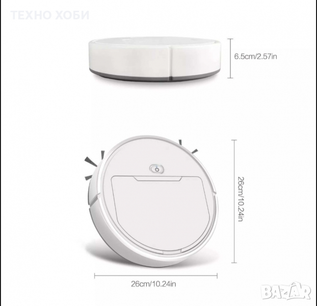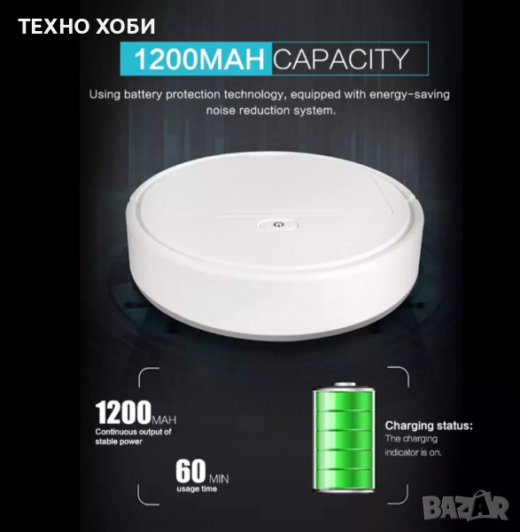 Премахва плака и алергиите: Системата за почистване е с високо качество, която премахва всяка вредна частица. Филтъра й осигурява задържане на 99,9% от праха. Почистете дома си докато гледате телевизор, готвите или четет любимата си книга. Безшумна: Прахосмукачка, предлага напълно безшумна работа, като нивото на шум е 20-40dB. Това ви позволява да я използвате, без да се притеснявате дори в присъствието да малки деца. Сензор: Лазерният сензор е поставен в средата на устройството. Навигационна система: Снабдена е със Smart система, която се справя успешно с всяко едно препятствие и не позволява на робота да падне когато се срещне с опора. Резервоари: Роботът е снабден с два резервоара за прах и за вода. Висок капацитет на батерия: Снабдена е с батерия от 1200mAh капацитет, която може да издържи до 60 мин, след пълното и зареждане. Зарежда се бързо и лесно с помощта на USB кабел(вкл в комплекта), той е със стандартен жак отвор. Лесен контрол: Прахосмукачката се контролира лесно и бързо, само с един бутон, разположен в горната част. Четки: Снабдена е с две странички, четки с които ще се почисти всички ъгли и оптимизира покритието на площта. Практични размери: Тя е с височина 6.5 см и ширина от 26 см, които и позволяват да се движи под всяка една мебел, да достигне и най-мързеливите места.