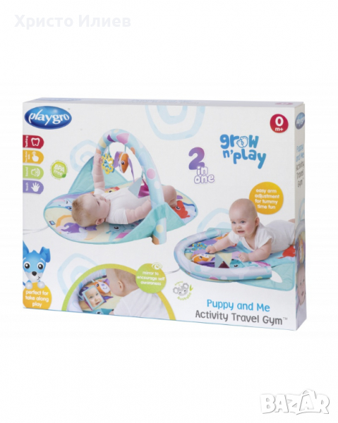 PLaygro Пакет за забавления с Puppy и приятели! Достатъчно компактен, за да го вземете навсякъде, но изпълнен с увлекателни функции за игра, Puppy and Me Activity Travel Gym прави играта на пода с бебето толкова лесна... където и да сте! Двустранната мека арка за игра отгоре се отличава с цветни форми за визуална стимулация, докато три играчки за активност насърчават бебето да достига и хваща. Просто регулирайте позицията на арката за игра на корема, където бебето може допълнително да изследва отразяващото огледало за самосъзнание, да намери облекчение за възпалените венци с неравните зъбки или да практикува хващане и разклащане с очарователната дрънкалка Puppy. Красиво илюстрирана постелка за игра е ярка, енергична и забавна, осигуряваща защита между бебето и пода, докато те упражняват грубите си двигателни умения. Удобен сгъваем дизайн,