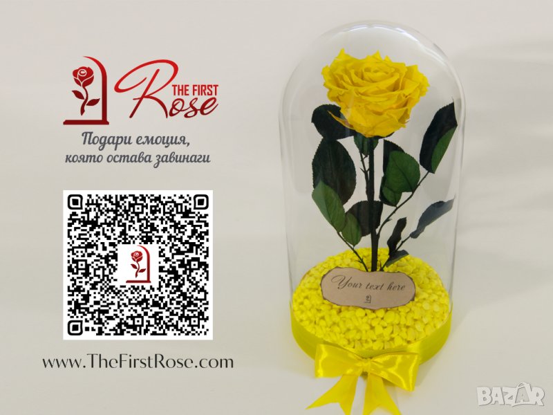 Представяме на вашето внимание уникална, ръчно изработена истинска вечна жълта роза в стъкленица.
