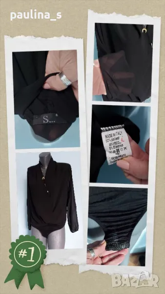 1. Колаж / Предлагам едно изумително боди за повод, с много секси аутлук. Деколтето е с прихлупване на дипли отпред, започва от ластичен набор на врата, а долната част е еластична и се вдига до талията, не съм го направила на снимките, защото е ново и не искам да го разпъвам, закопчаването е със секретни копчета. Горната част е от копринена органза с буфон ръкави.