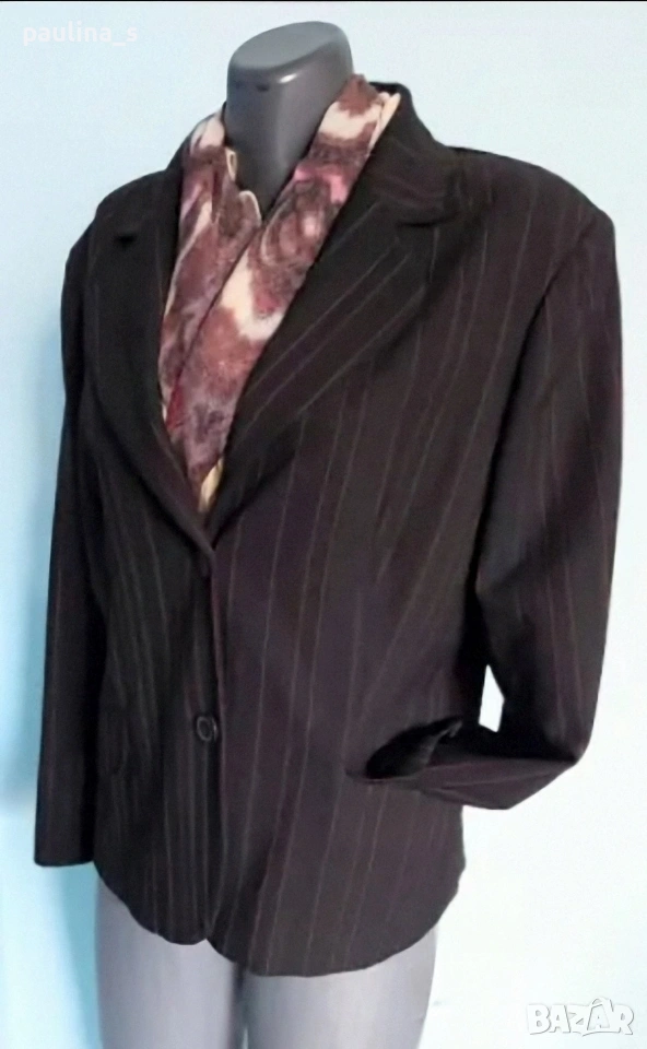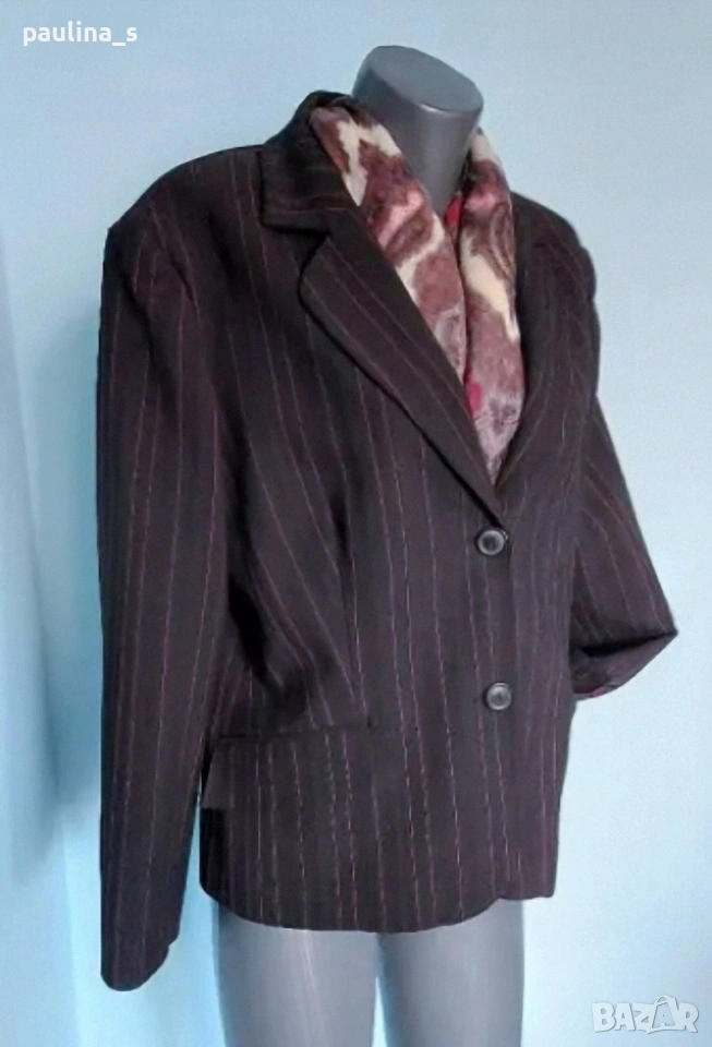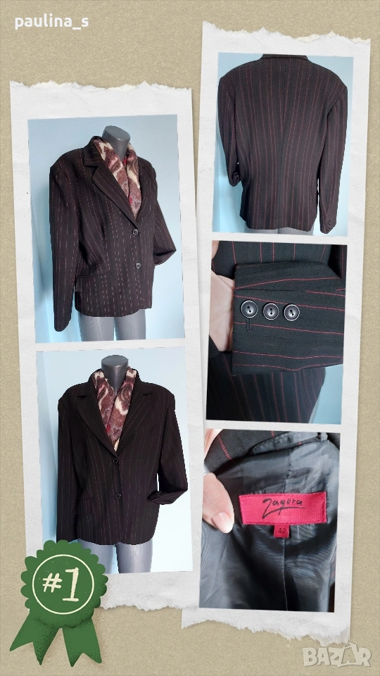 2️⃣. Колаж / L / 2XL "Zagora". Цената е крайна, без пазарлъци 12,5 евро. Стилно вталено сако с червени райета. Моделът е еднореден, джобовете са с капаци, платът е еластичен габардин - полиестер и полиамид, немачкаем, стои луксозно. Покрива дрескода за офис. Като ново, без дефекти и етикет.