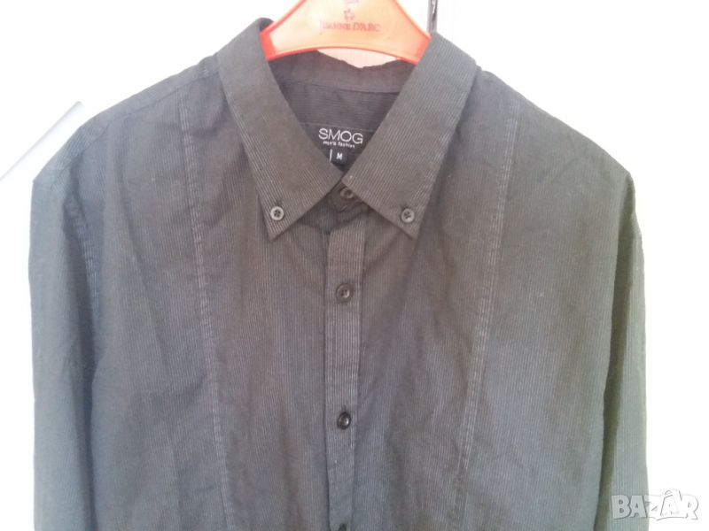 Мъжка черна риза с много тънки нишки, почти незабележими и два допълнителни тигела от двете предни страни. Ризата е с дълъг ръкав, размер М, рамене 42 см, гърди 52 см отпред /обиколка 104 см/, надолу права, дължина 67 см, ръкав 65-66 см. Ризата е разопакована и пробвана веднъж, като нова. Отговарям на съобщения тук, изпращам с куриер или лично предаване в София.