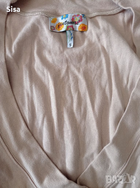 Блуза С размер, финна, бежов цвят, ширина подмишници 37-40см, дължина от рамо 53см, ръкав от рамо 51см.