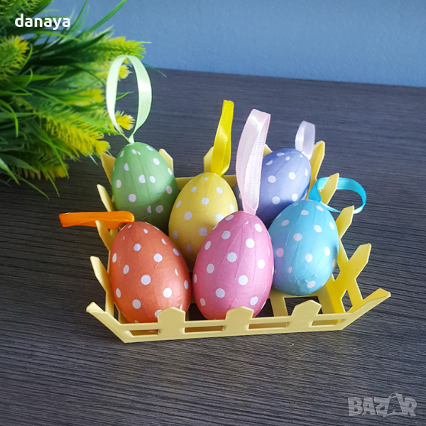 Материали: пластмасово панерче, стиропорени яйца