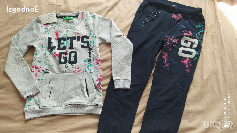 Спортен екип, много интересно и модерно моделче. Горнището е ново с етикет. Долнището е прано, обухме го веднъж, но дъщеря ми е по пухкава, има коремче и дупе и и едва плитък модела и отказа да го носи. И така си остана.
