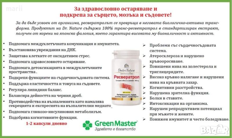 Ресвератролът е уникален продукт с изявено антиоксидантно, венотонично и кардипротективно действие.Всяка капсула съдържа 100мг стандартизиран екстракт от корен на японска фалопия (Polygonum cuspidatumSieb), от който 50 % ресвератрол (50 мг.)