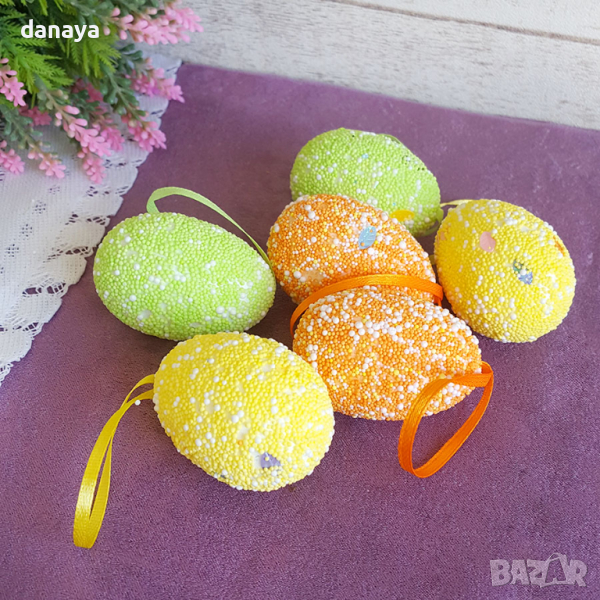 Декоративни шарени великденски яйца с връвка за окачване на цъфнало клонче, ваза с цветя, или на стена. Яйцата са обсипани с множество малки топчици и лъскави листенца. Чудесна декорация и украса за светлия празник Великден.