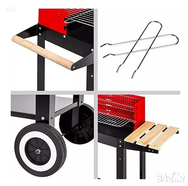 - Функционалност: Дървените рафтове (страничен и долен) са идеални за прибори, чинии и въглища.