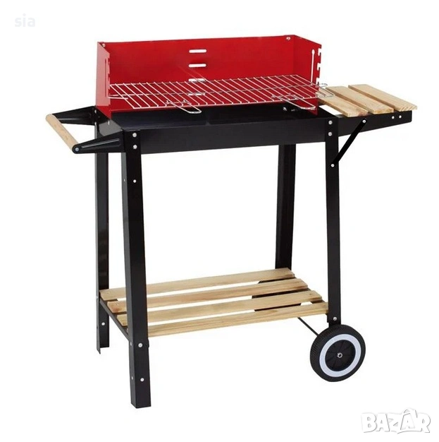 Скара на колела за дърва и въглища. Изработена от метал с електростатично прахово боядисване – устойчива и преносима, благодарение на двете колела за лесно преместване. С дървена дръжка и голяма готварска площ – 48.4x26 см, както и помощна дървена поставка отдясно. Идеална за печене и приготвяне на храна.