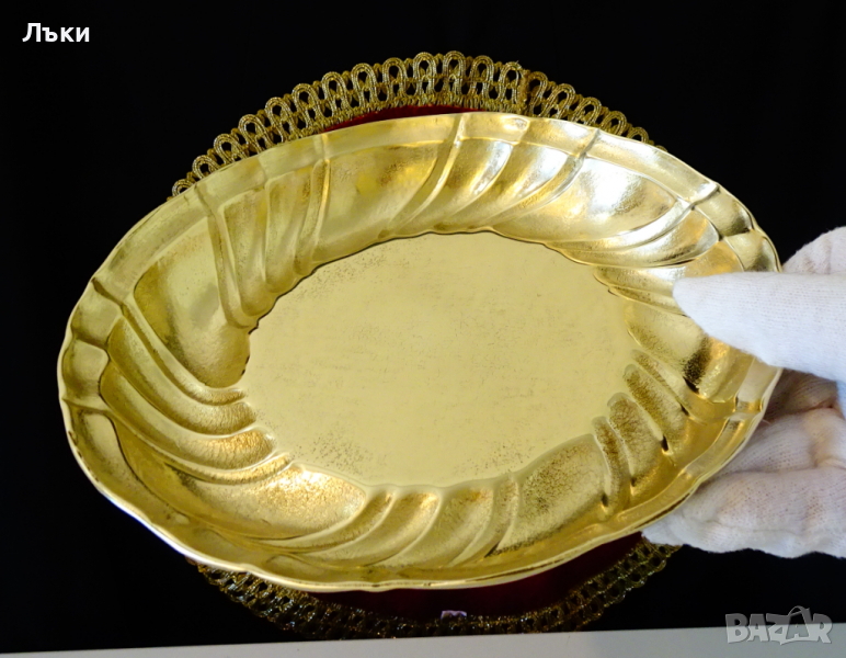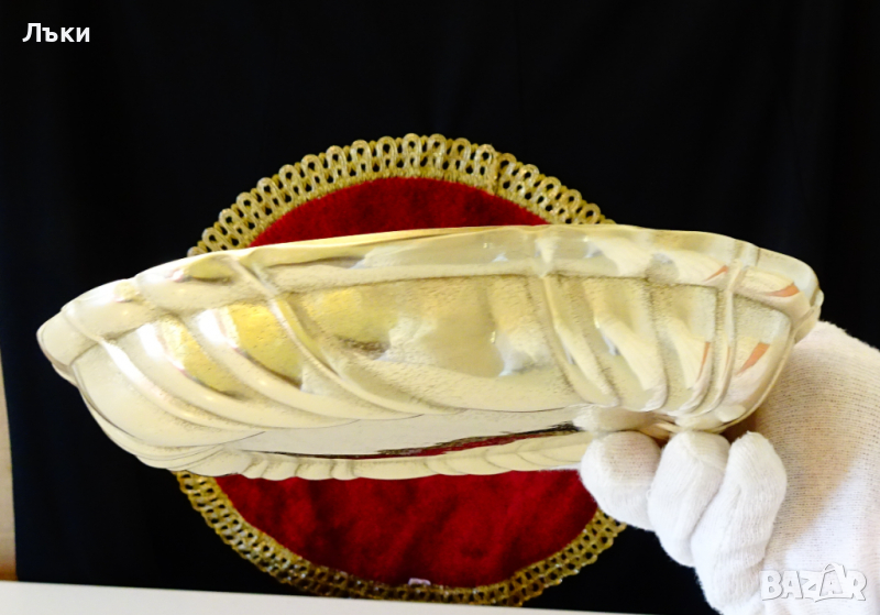 Старинна немска бронзова фруктиера,съд за сервиране или съд за печене,ръчно отлят от масивен златен бронз с красив релеф.Вечен съд,гордост за всяка трапеза.Височина 3 см.,диаметър 21.5 см.,тегло 470 гр.