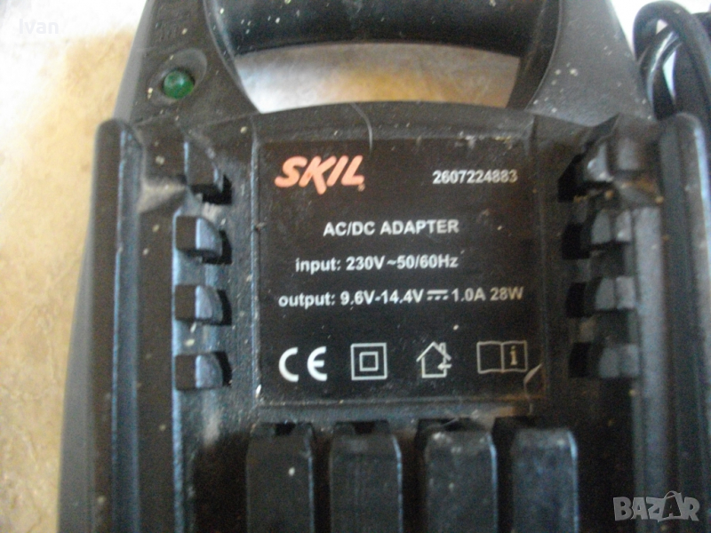 Зарядно за акумулаторни батерии на Скил-Skil и Бош-Bosch, литий-йон технология,от 9,6 до 14,4 волта.Марка и каталожен номер на зарядното-Skil 2607224883.Зарядното лека е зацапано с боя,но е в отлично техническо състояние.работи много добре.Характеристики-9,6-14,4 волта,1,0 ампера,28 вата.1 зелена мигаща индикация.Дръжка за хващане.Корпус-твърдосплавна трудно запалима бакелитова пластмаса.Липсва стикера от задната страна с държава производител.