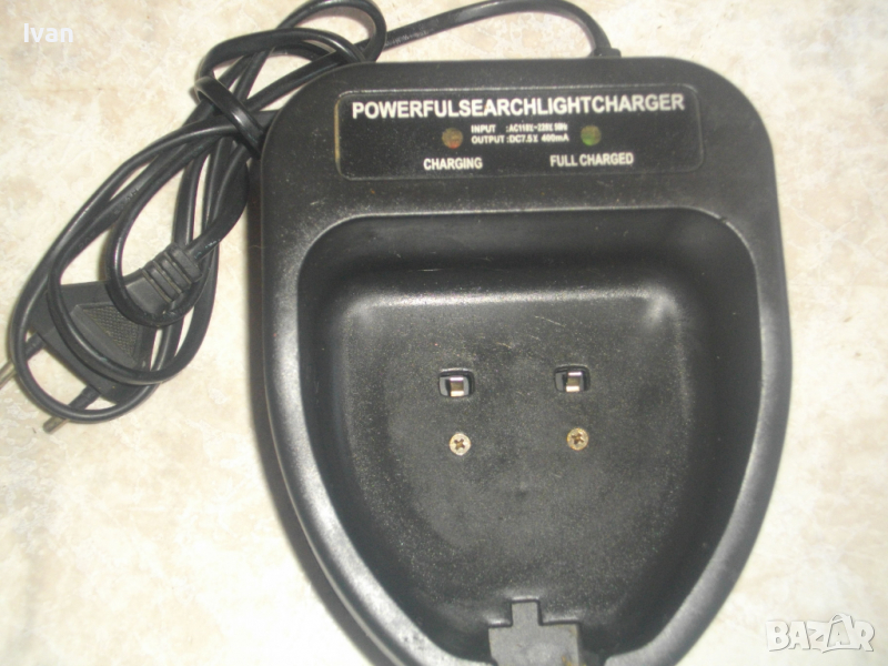 Почти ново зарядно за батерии 7,2 волта, специфичен модел, показан на самото зарядно. Марка на зарядното - универсално - Power ful search light charger. Запазен външен вид и техн. състояние - отлично. характеристики - 7,5 волта - 400 милиампера, 50 херца, 220 - 230 волта мрежов ток. Кабел - с евро щепсел.Две светлинни индикации - зареждане и пълно заредено.