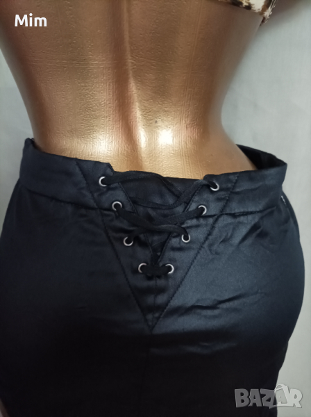 Сатенена , еластична пола в предната част е със светкавица от пайети,отзад с ширити , закопчаване е странично с цип.Талия 39см едностранно, ханш 47 до 52 см едностранно, дължина 30 см.