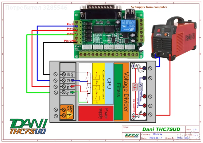 Регулаторът е предназначен за работа с всички видове плазмени режещи машини, изградени с ЦПУ (Цифрово Програмируемо Управление / CNC - Computer Numerical Control) системи. Устройството работи както с нискочестотни, така и с високочестотни плазмени устройства. Изградено е с вграден вътрешен делител на напрежение, с опция за промяна на делението от 1/20 до 1/60. Регулаторът разполага и с вход за работа с плазмени устройства с вграден делител на напрежение. Микроконтролерът е Atmega 328. 3-цифрен 7-сегментен LED дисплей. Два многофункционални бутона за лесна настройка и 3 светодиодни индикатора за наличие на сигнал "arc" и сигнали за управление "нагоре" и "надолу". Разполага с 8 параметъра за настройка, което осигурява лесна и ефективна работа. За лесна инсталация има вградено захранващо устройство и работи директно на 220V от мрежата. За безопасна работа всички входове, изходи и захранване са галванично разделени.