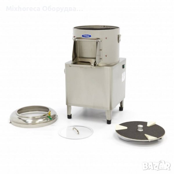 Автоматична Картофобелачка с капацитет 8 кг белене и измиване на картофи, 2-3 минутен цикъл до 160 кг на час. От горната страна на машината влиза чистата вода, която задвижва картофите по шкурката и гарантира равномерно белене. За бързо и ефективно почистване в долната част е разположен дренаж и контейнер за отпадъци. Устойчива конструкция от неръждаема стомана. Подходящ за картофи, моркови и ряпа. Корпус, купа и врата от неръждаема стомана. Лесно сваляща се плоча устойчива на абразивни препарати със специален дизайн. Проста и здрава конструкция. Стои на четири гумени крака. Технически параметри на продукта:
