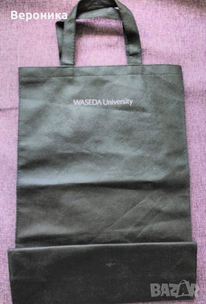 4. Сувенирна тънка чанта на университета Васеда. Размери: височина 44 см, ширина 22 см и дебелина 12 см. Цена 2 евро.