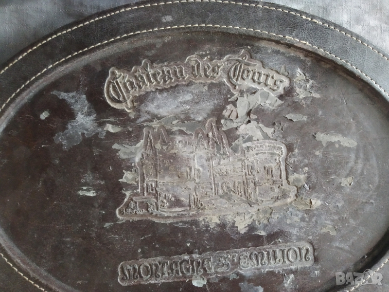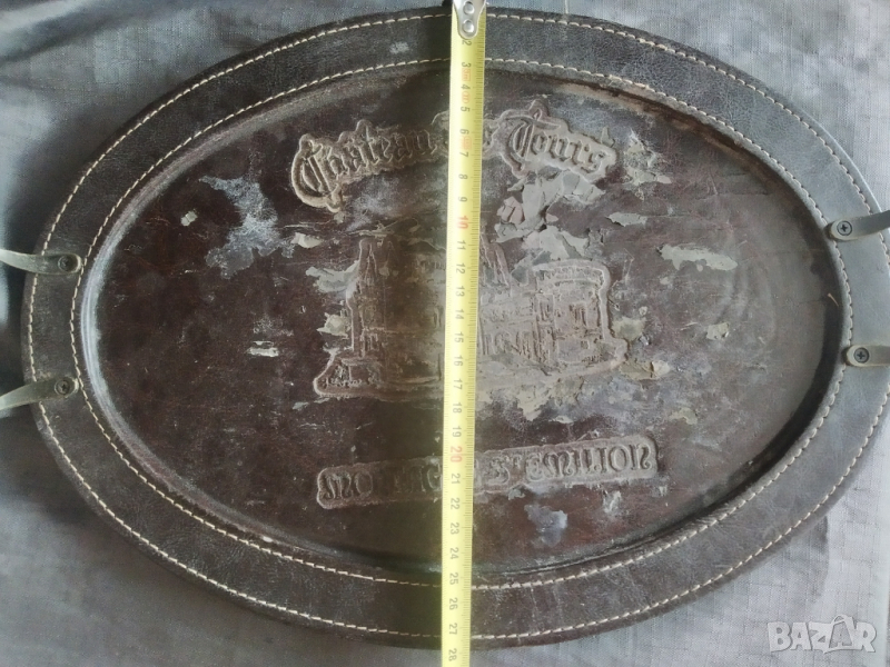 стара табла,поднос,дървена основа,облицована с кожа,местални дръжки.състояние видно на снимките.