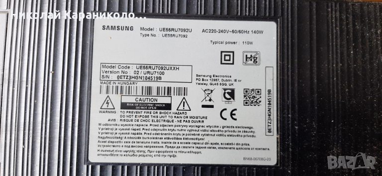 Продавам тв SAMSUNG UE55RU7092U за части по причина-счупена матрица/CY-NN055HGLV2H/.Редовни съответно: