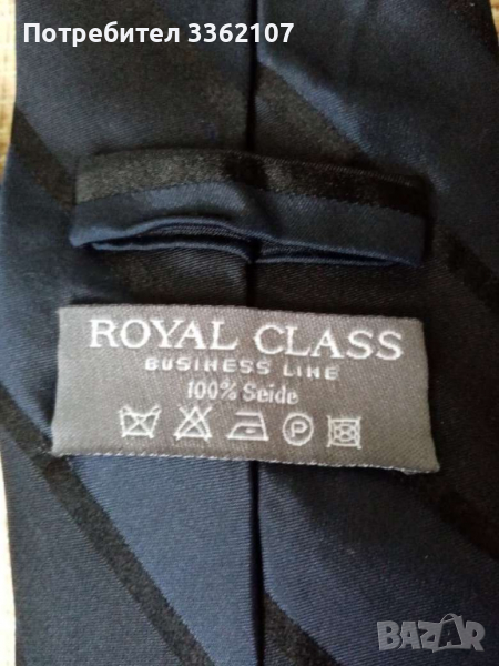 Продавам мъжка копринена вратовръзка, Royal Class. Има едвам забележима забележка, видима на снимките - черното райе е изтъркано, отдолу е тъмно синята основа.