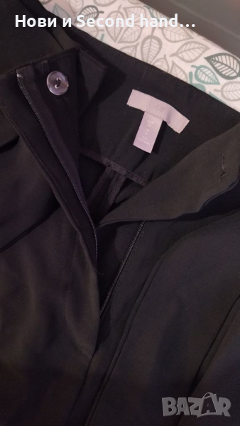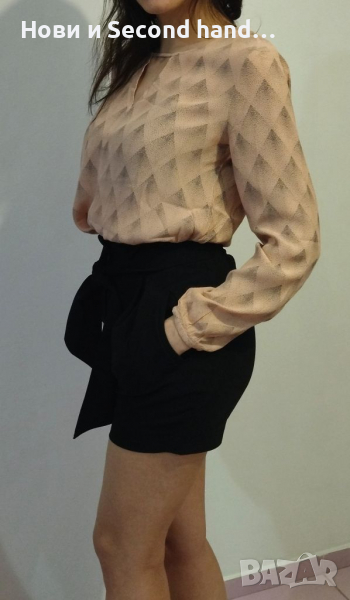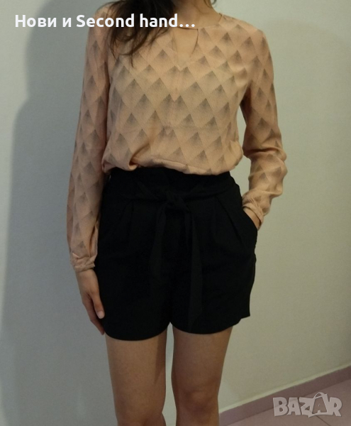 Къси елегантни панталонки в черно с висока талия и зашит колан, размер 32. Материята няма еластичност, стилен модел. Ширина - 83см, дължина - 40см.