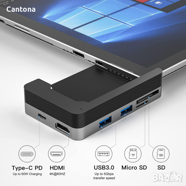 Докинг станция BYEASY Surface Pro 7, 6-в-1, 4K HDMI, PD 60W Type-C, SD/TF четец на карти, 2 USB 3.0