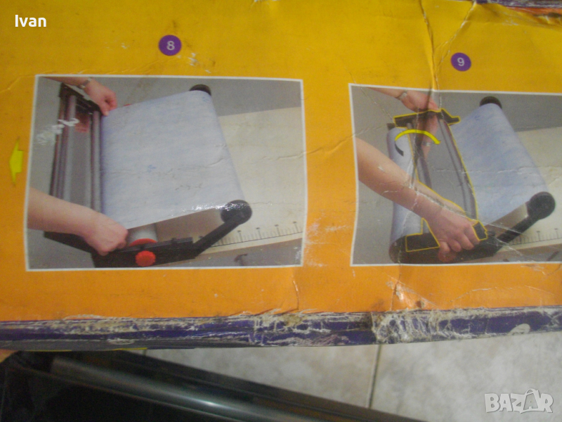 Машината е 2в1 - освен облепяне на тапета може да се среже нужната дължина посдством метален ръб на машината.