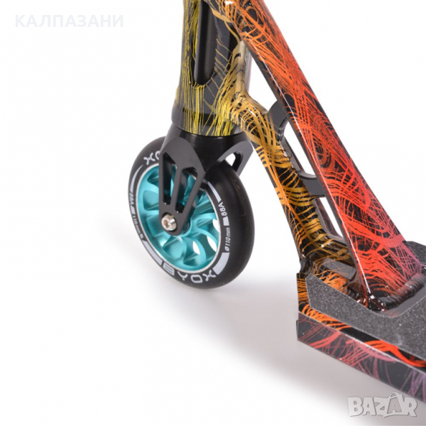 Страхотната тротинетка за трикове от Byox - Chaos - е впечатлява със стилния си дизайн, който я прави возило мечта за всеки малчуган. Тя има стабилна алуминиева основа и водно трансферен принт. Оборудвана е с усилено монолитно кормило за 360° въртене, което е идеално за трикове.