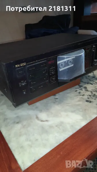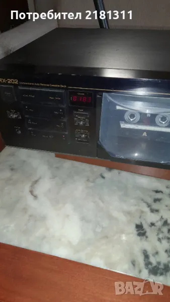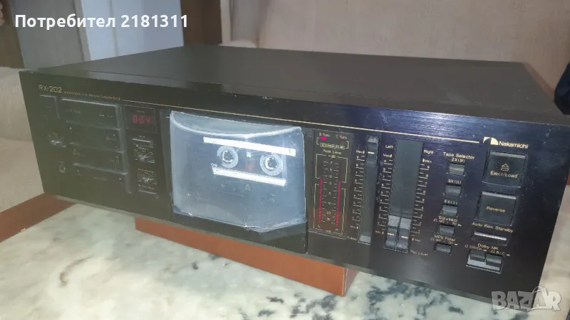 Dolby B NR Dolby C лого Full Logic Metal Tape Този Nakamichi RX-202 е стерео касетен дек с автоматично реверсиране и намаляване на шума Dolby B и C, за първи път е продаден от Nakamichi през 1982 г. и преустановен 11 години по-късно през 1993 г. Основните характеристики на Nakamichi RX-202 са: 2 глави, цифров брояч на ленти с 4 цифри и спиране на паметта, ръчен избор на тип лента и възможност за работа с нормални, хромирани и метални ленти с допълнителен избор на ръчно изравняване, ремъчно задвижван транспорт с един капстан . Типичен касетен дек с предно зареждане с касетно отделение, разположено в центъра на дека. Зареждането/разтоварването на лентата се управлява моторизирано и касетата трябва да се постави с главата надолу в гнездото за касета. Нивомерите, използвани в RX-202, са цифрови LED пикови измерватели. Пълните логически транспортни контроли, използвани в RX-202, му позволяват да реагира и на най-малкия допир с пръст за бърз и лесен избор на транспортна функция. Dolby C-тип, използван в RX-202, осигурява 20 dB намаляване на шума над около 1000 Hz, напълно удвоявайки количеството, дадено от B-тип. 19kHz мултиплексен пилотен сигнал, присъстващ в FM стерео предаванията, може да причини фалшиво задействане на системата за намаляване на шума. Превключващият MPX филтър на RX-202 филтрира пилотния сигнал и осигурява правилна Dolby обработка на FM стерео програми.