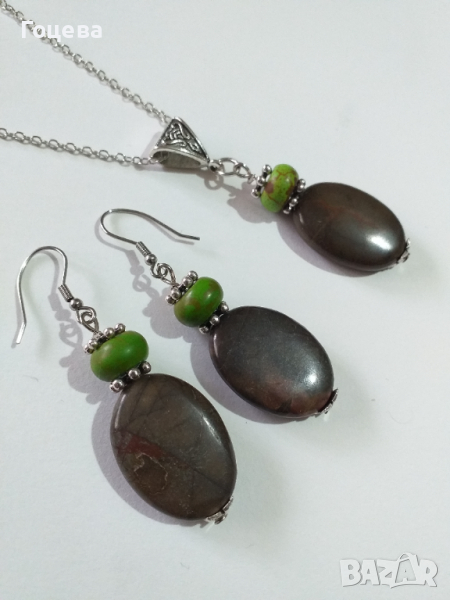 Красив комплект бижута с голям Яспис Пикасо и зелен Хаулит с красиви орнаменти в цвят Сребро → Обява 36499787