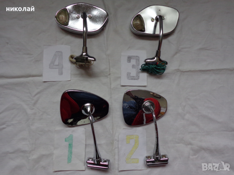 Четири броя външни никелирани огледала за М-ч 408/412 огледалата са номерирани: номер1 употребявано ИЗЧЕРПАНО, номер 2 употребявано ИЗЧЕРПАНО Номер 3 употребявано Цена 199 лв, номер 4 чисто ново Цена 499 лв