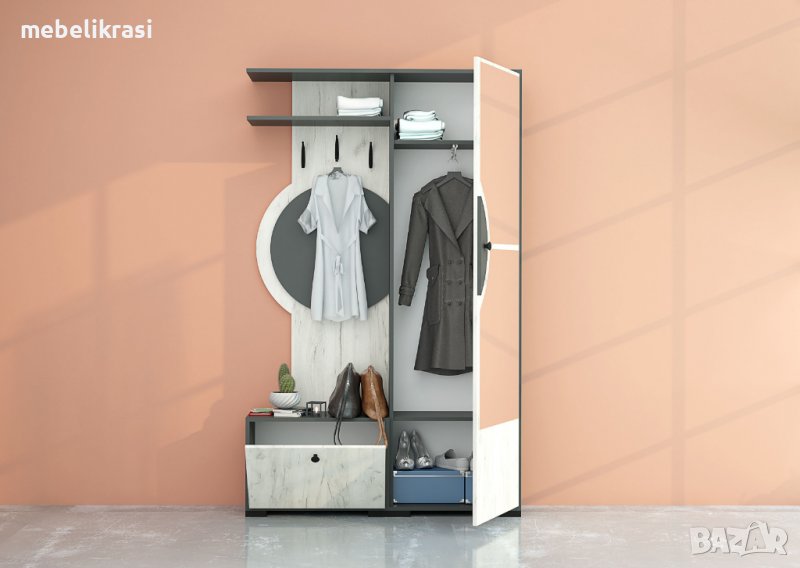 Нестандартна, но в същото време елегантна визия - това са първите впечатления от портманто Фини. Заоблените му линии придават индивидуалност която се запомня веднага. Голямото огледало ще ни улесни до максимум, а гардероба с изтеглящ се лост за закачане в допълнение с шкафа за обувки го правят първи избор сред останалите модели. Портманто Фини ще придаде завършен вид и ще стане неделима част от коридора ви. Портмантото е с размери: Ш/115 В/187 Д/30 см.