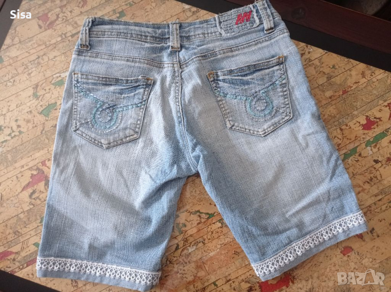 Къси дънкови панталонки, размер С или 34, талия 35см, ханш 42см, дължина от кръста 39см.