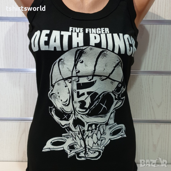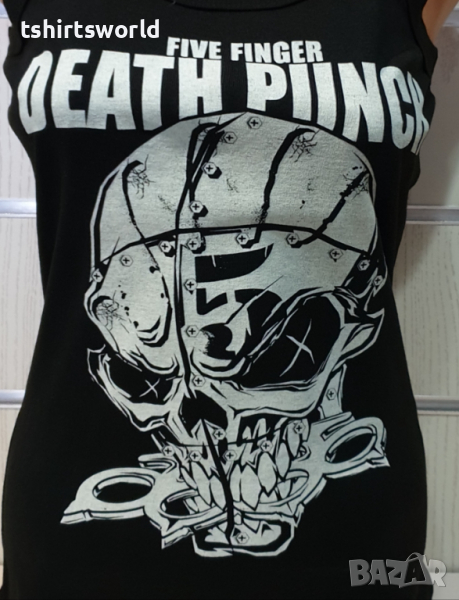 на музикалната група Five Finger Death Punch, U-образно деколте и Х-гръб или прав гръб. Произведен в България под марката PRINTEX от висококачествен 100% памук. Леката и удобна материя е гарант за прохлада и комфорт в горещите летни дни, а вталена му кройка го прави подходящ както за спорт, така и за ежедневно носене с дънкови панталони. Потникът е с професионално изработен висококачествен дигитален печат, устойчив на пране с години и може да се пере при температура до 40 градуса. Спокойно можем да гарантираме за качеството на изработката и ярките цветове на дизайна.