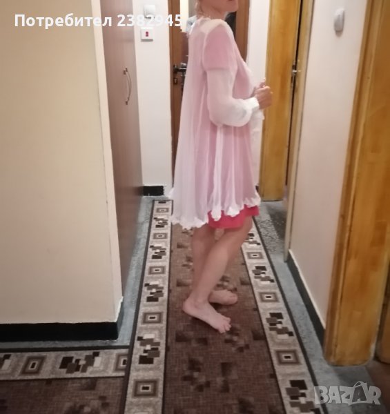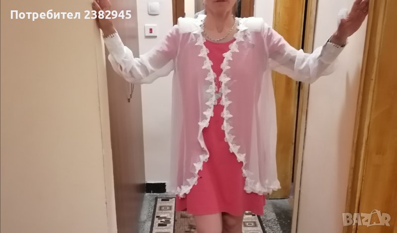 Роклята е цялата в дантела. С много нежно наметало отгоре, което по края завършва пак с дантела.