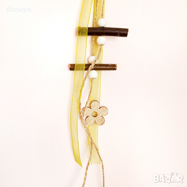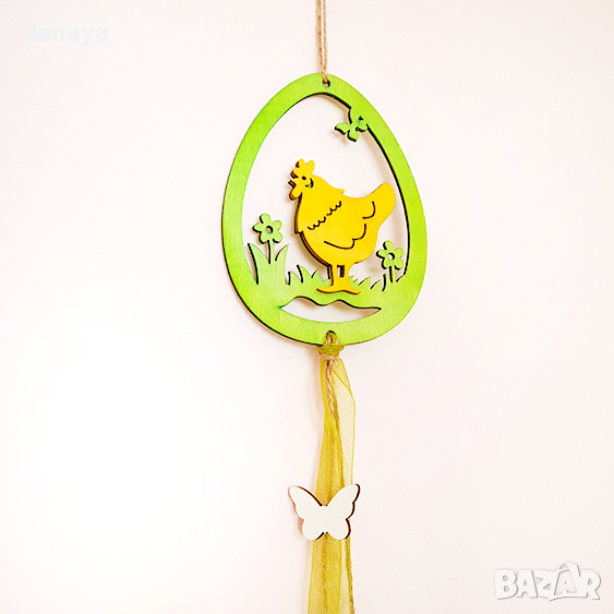 Декоративна висулка за стена, врата или шкаф. Яйце с кокошка от МДФ материал, декорирани с панделка и орнаменти. Красива видяща декорация за Великден. Размери: 12×40см